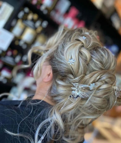 Hair pieces may be provided by the guest or purchased through the salon. Includes veil placement when applicable.
