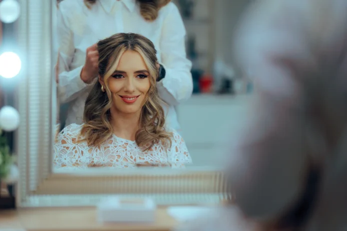 Wedding day hairstyling with long-wear finishing and on-site support.